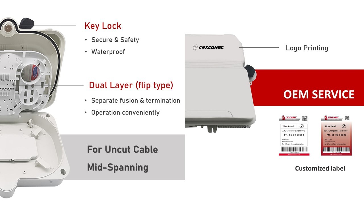 CRXCONEC puede proporcionar la opción OEM para tener su propia impresión de logotipo de caja de distribución de fibra de 48 núcleos y personalizar el diseño de etiqueta adecuado para el canal de ventas.