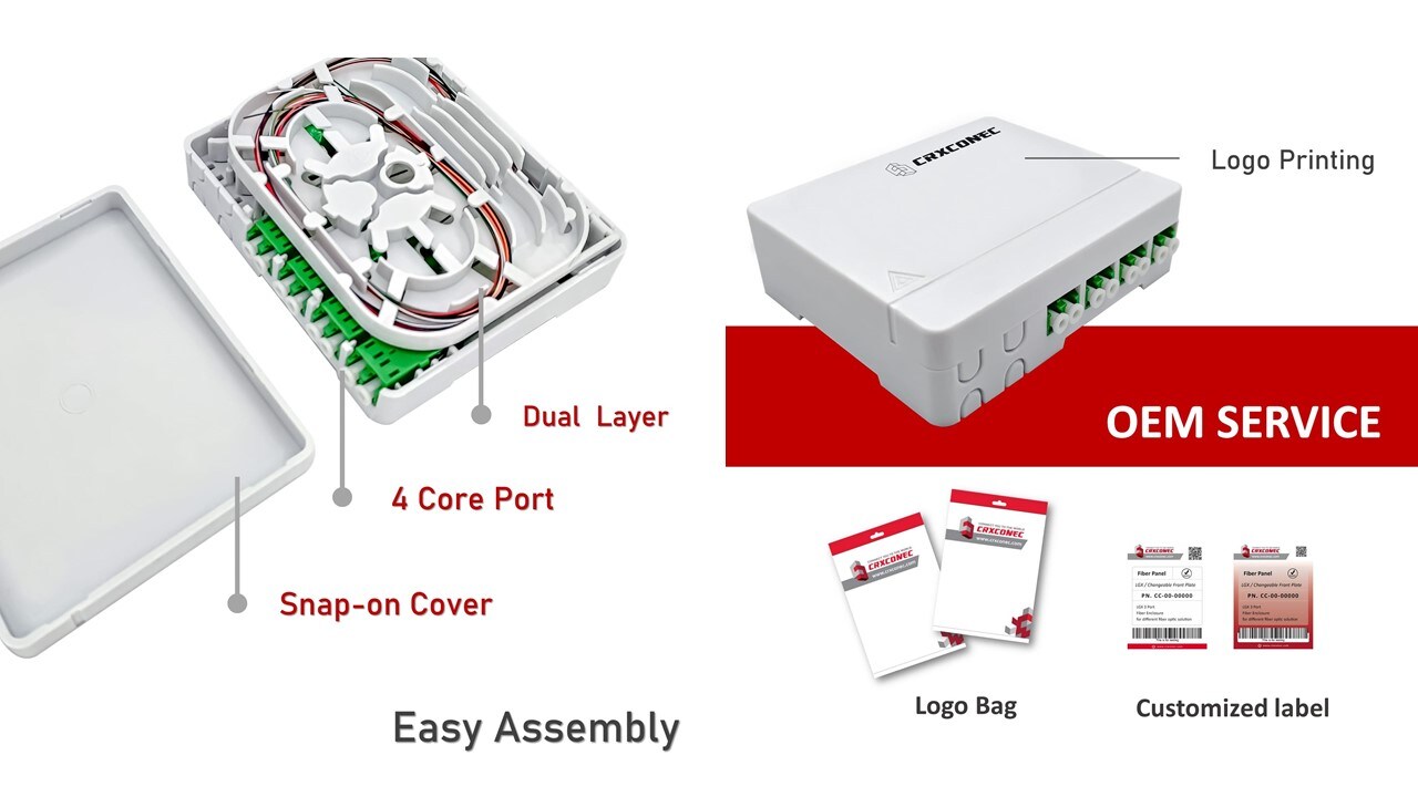 CRXCONEC puede proporcionar la opción OEM para tener su propia caja de distribución de fibra de 4 núcleos FTTH de marca, impresión de logotipo y diseño de etiqueta personalizado adecuado para el canal de ventas.